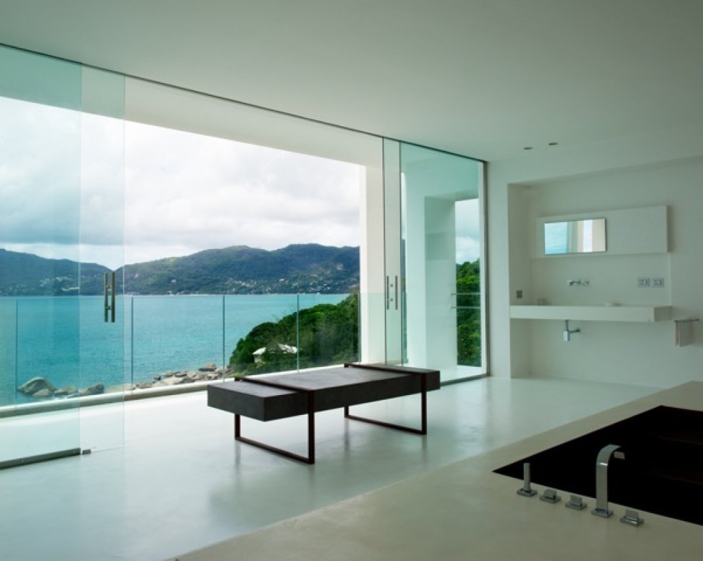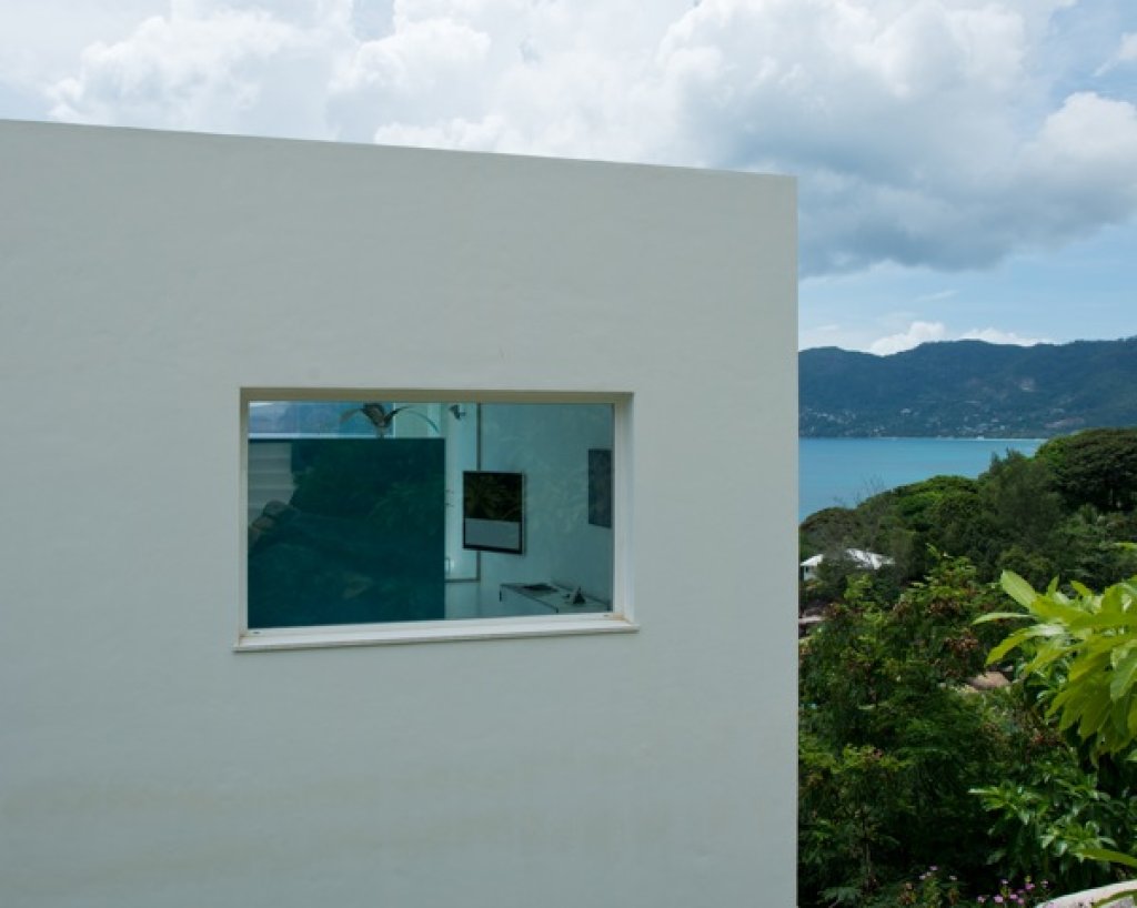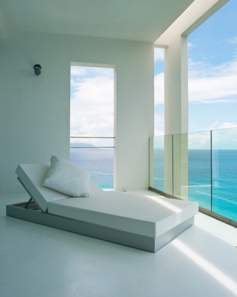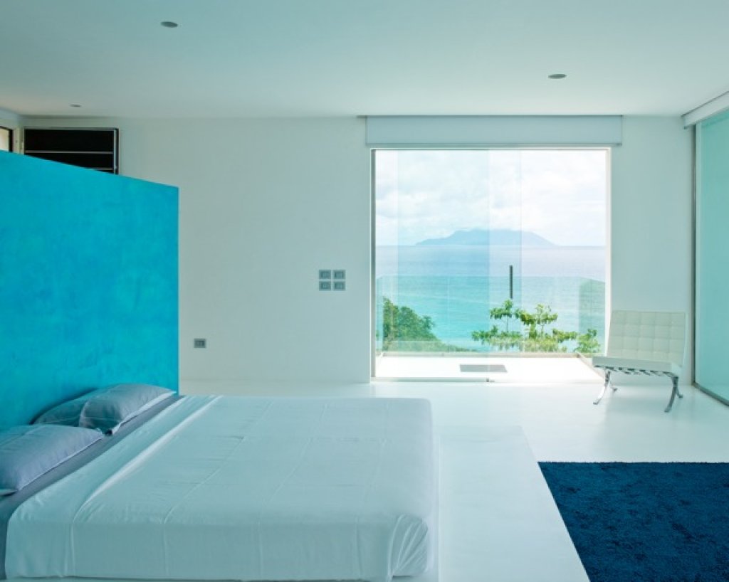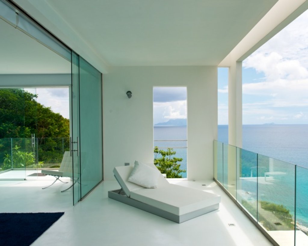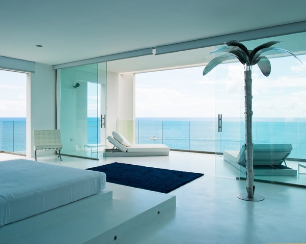 Master bedroom: 2 floors of 80 sq m each with a King size bed in the middle of the upper floor with a 7 meter solid glass window (without frame) with a wide balcony facing the ocean and some of the inner islands.