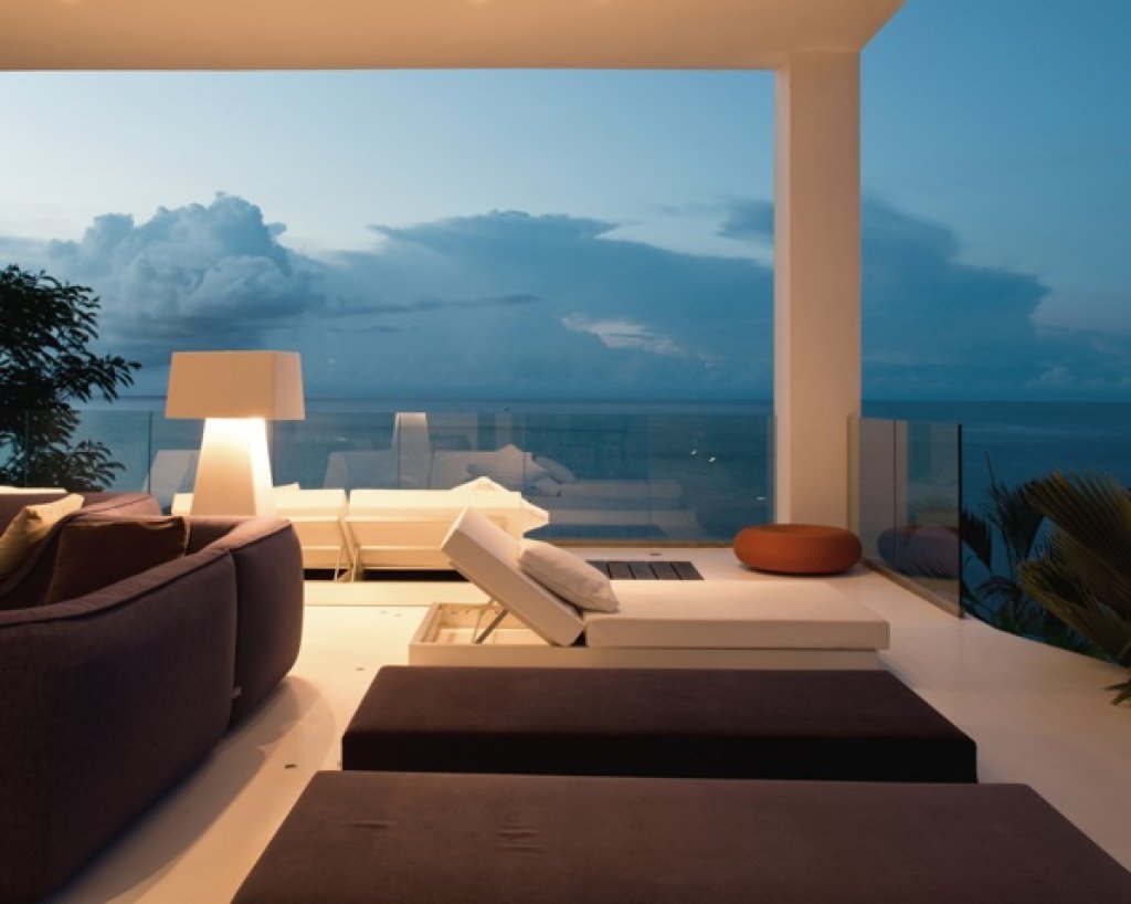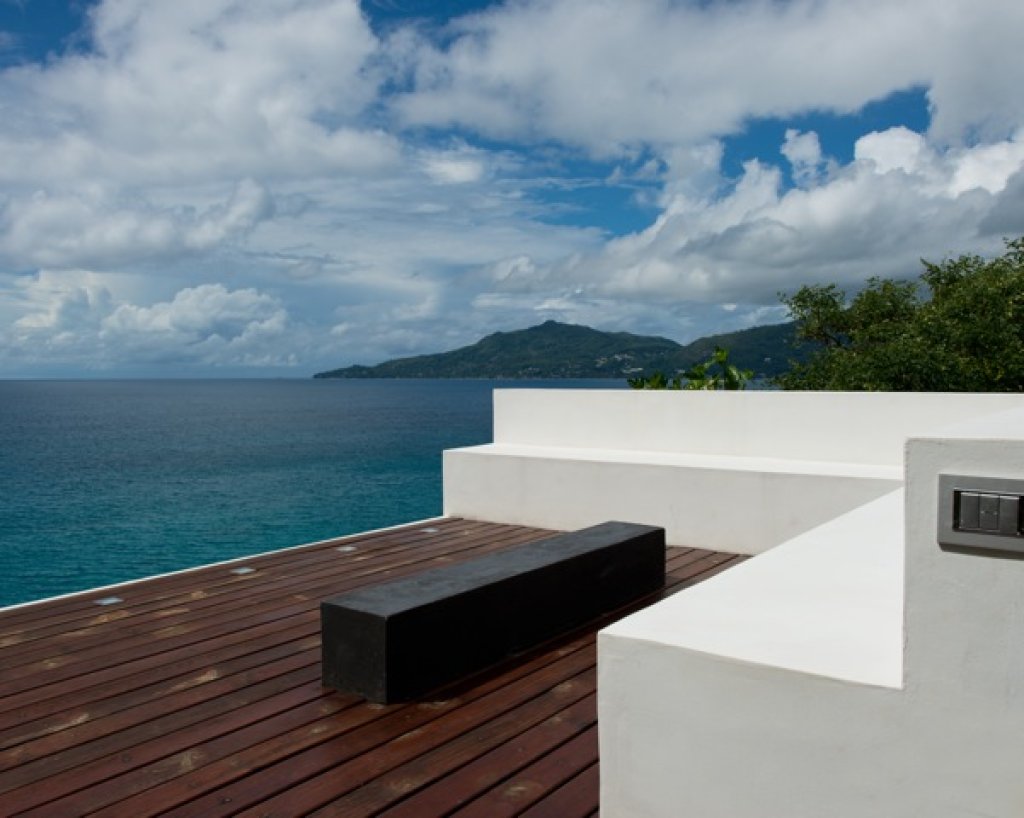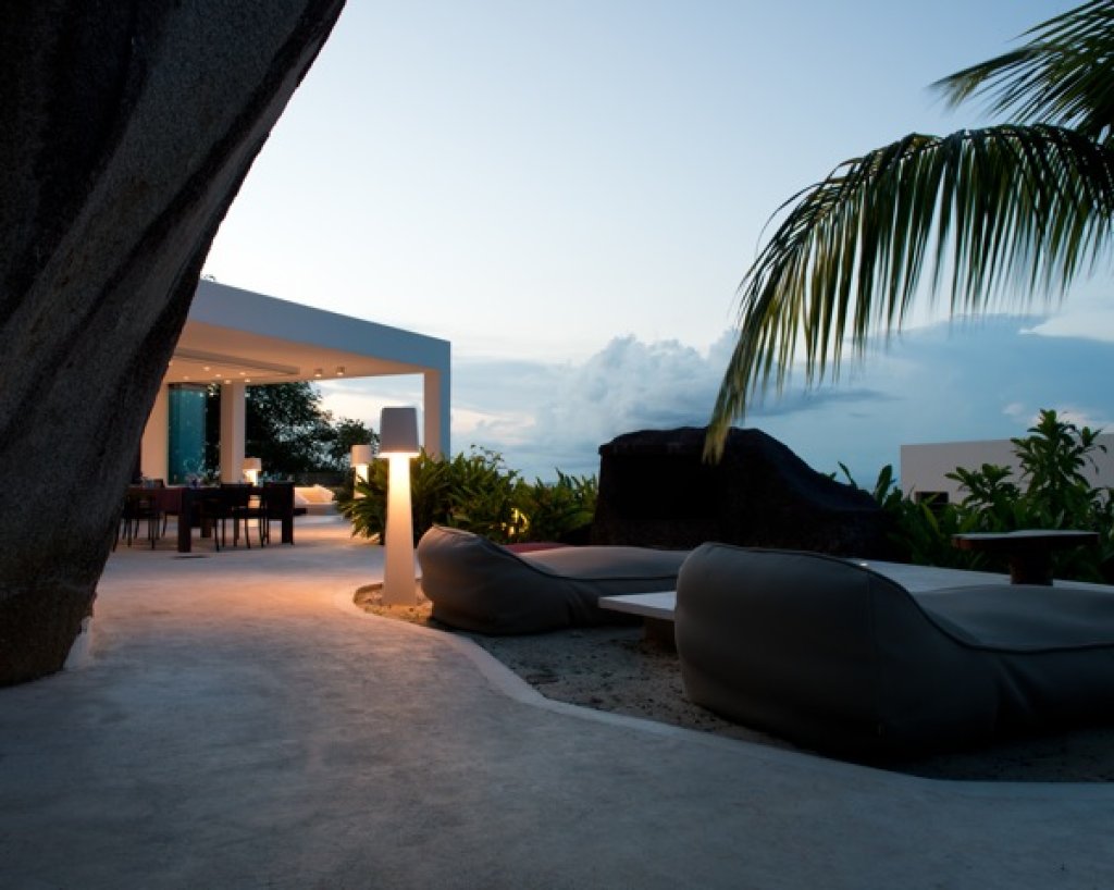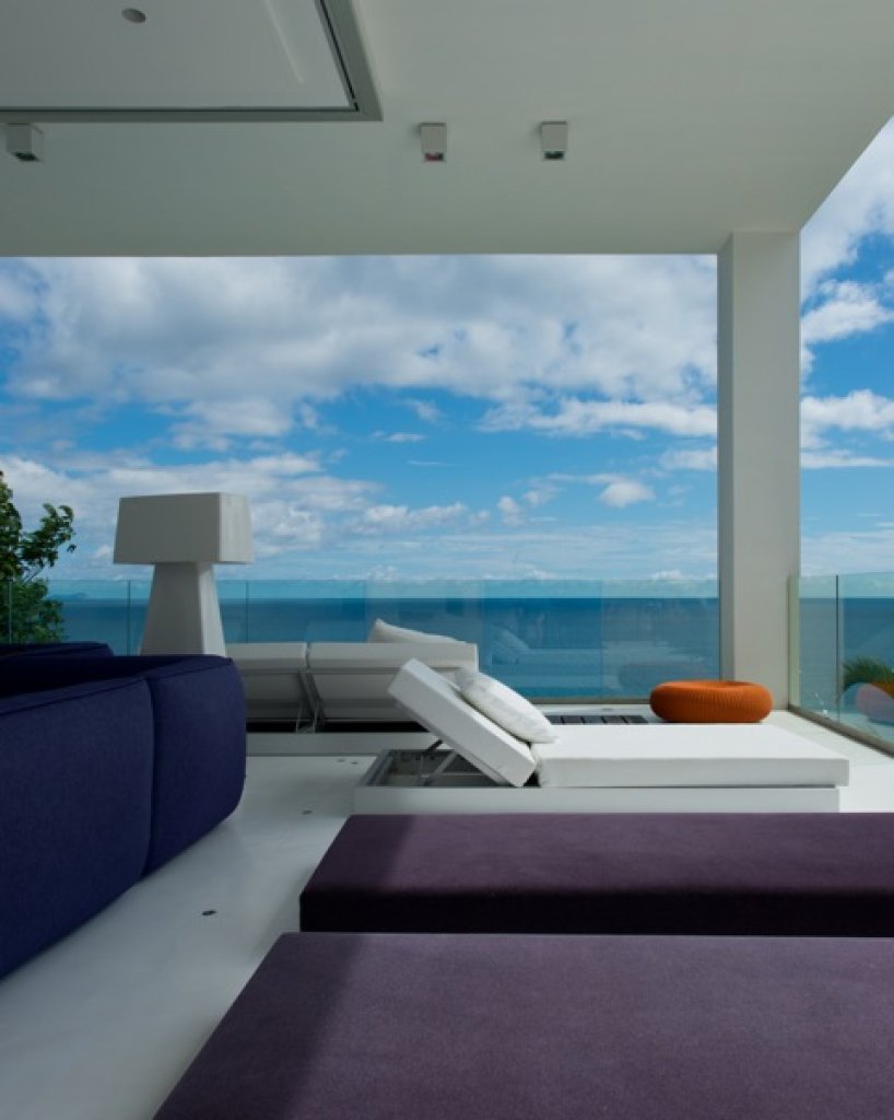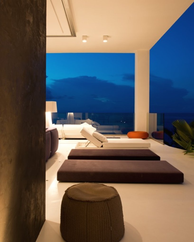 Living room: a white parallel piped building (144 sq m) that seems to hang over the ocean that includes the living room with sofa and TV (B&O), a relaxing area with big sun bed and the kitchen. The area of the living continues with a wide platform of 200 sq m with ample space where with different groups of sofa. Dining options on different tables outside.