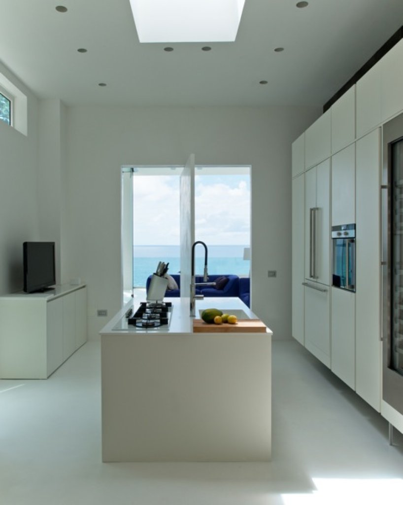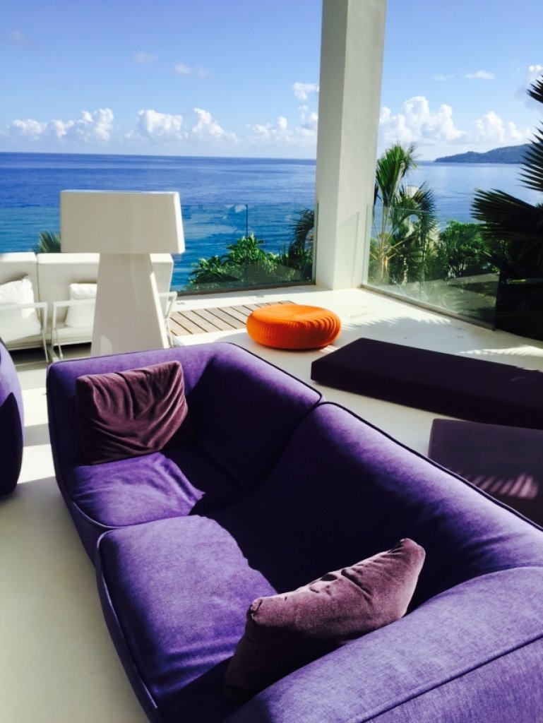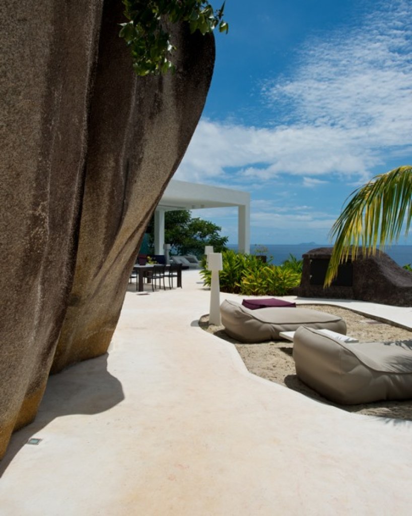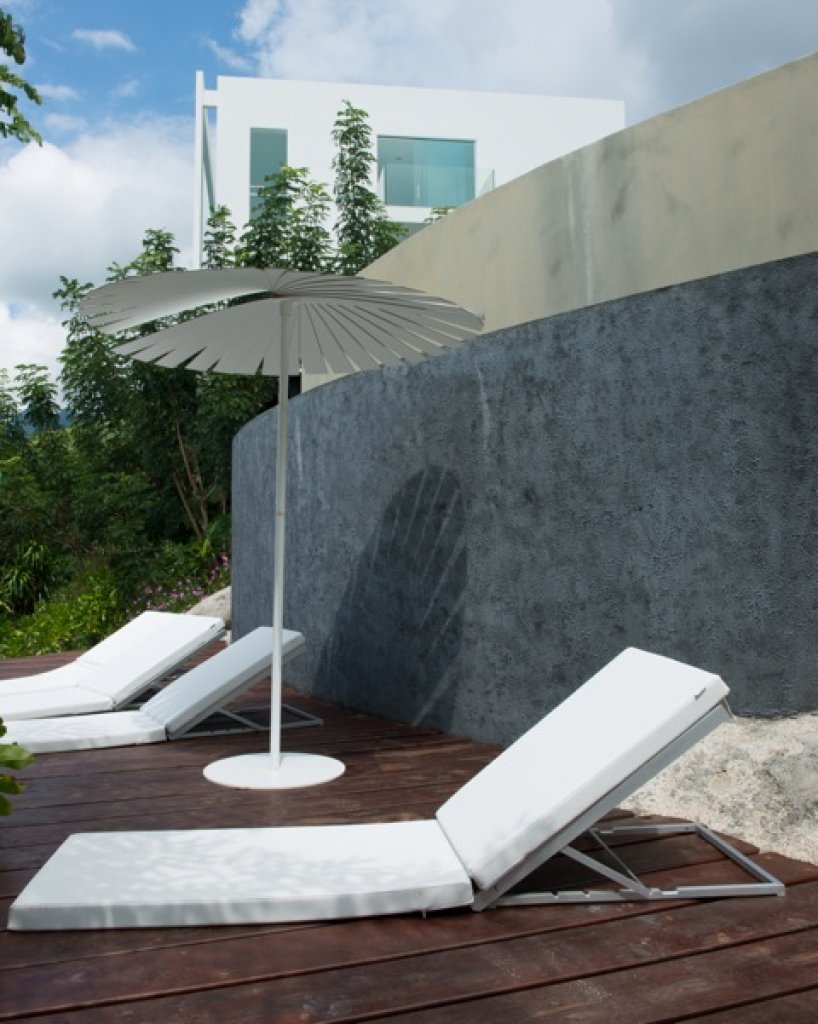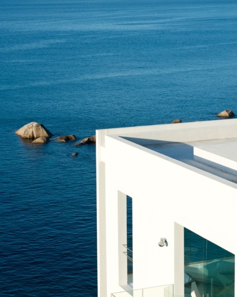 Living room: a white parallel piped building (144 sq m) that seems to hang over the ocean that includes the living room with sofa and TV (B&O), a relaxing area with big sun bed and the kitchen. The area of the living continues with a wide platform of 200 sq m with ample space where with different groups of sofa. Dining options on different tables outside.
