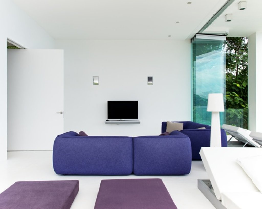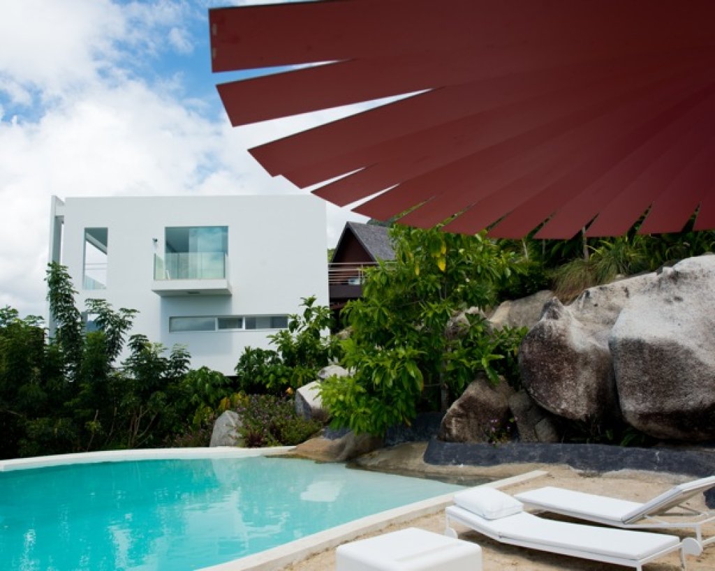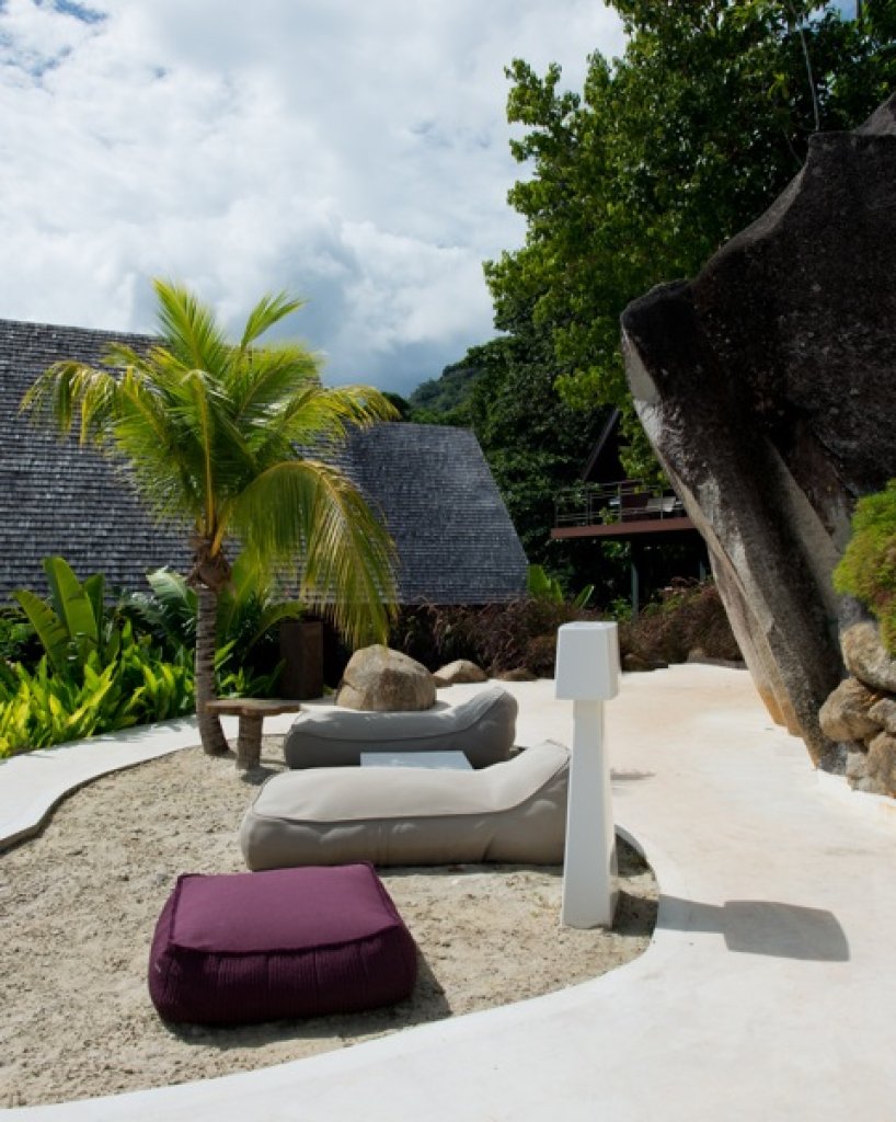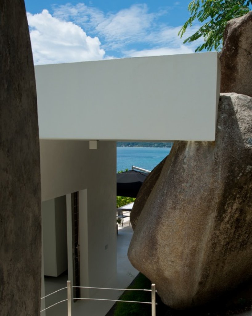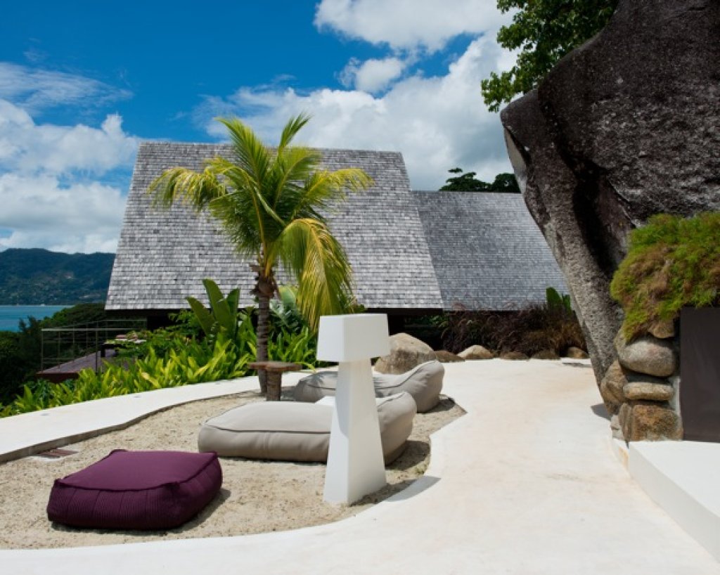 Living room: a white parallel piped building (144 sq m) that seems to hang over the ocean that includes the living room with sofa and TV (B&O), a relaxing area with big sun bed and the kitchen. The area of the living continues with a wide platform of 200 sq m with ample space where with different groups of sofa. Dining options on different tables outside.
