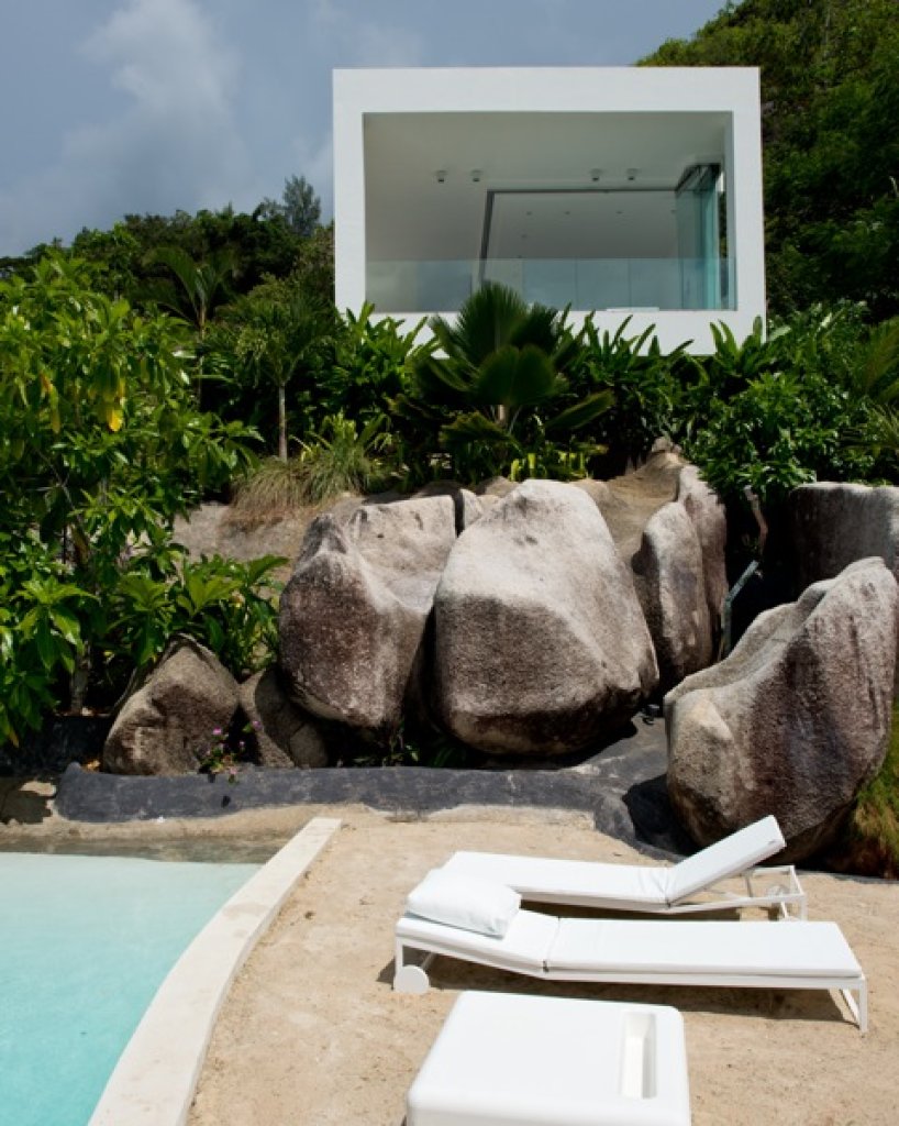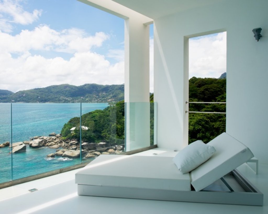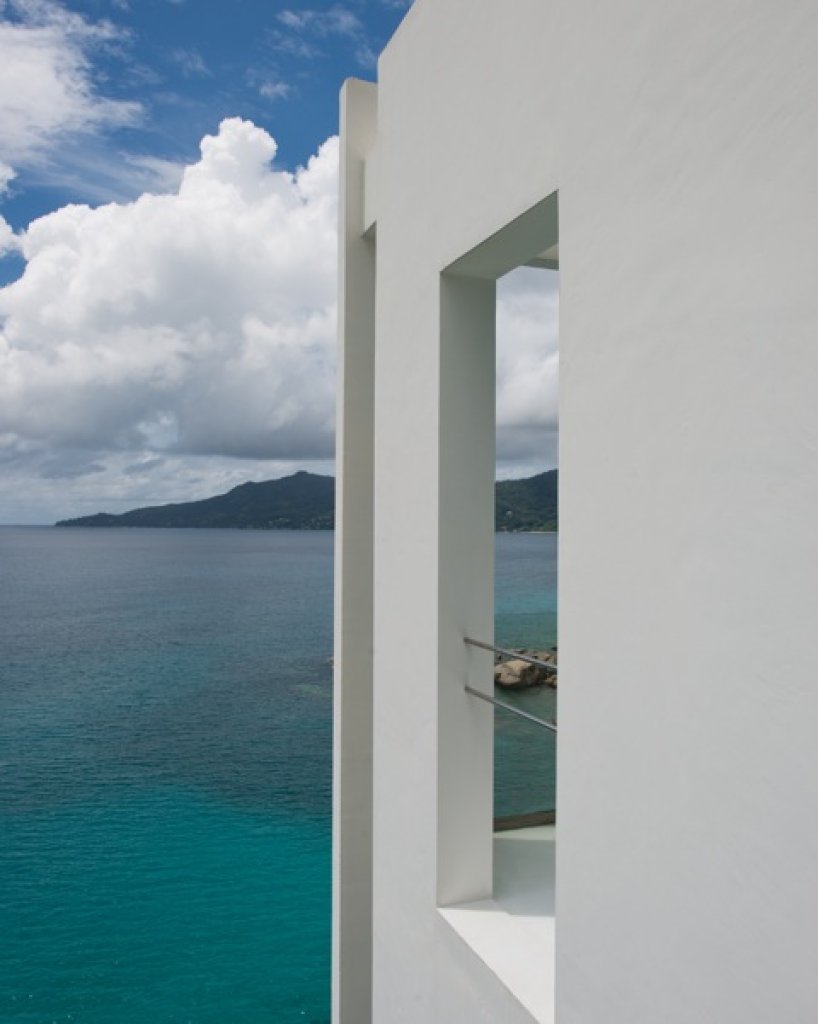Fitness suite: a 25 sq m white suite with pilates equipment and a bathroom all done of windows with a 180° view of the ocean built on a rock sheer on the ocean